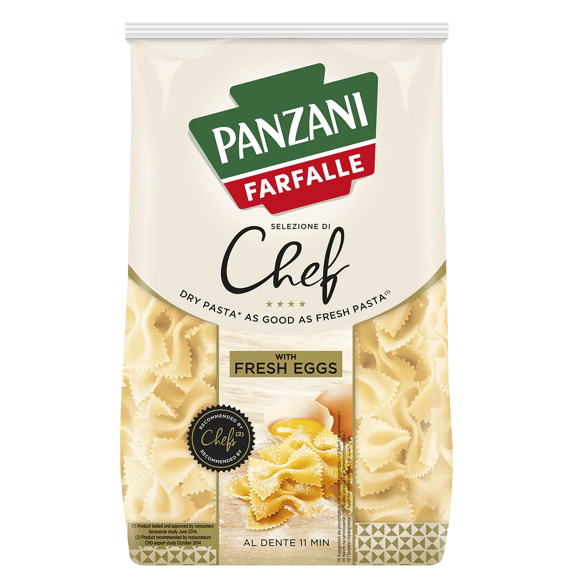 Farfalle Selezione di Chef de la Panzani sunt concepute pentru a oferi o experiență culinară excepțională. Cu forma lor delicată de papion, aduc o tușă elegantă preparatelor tale și se disting prin gustul lor bogat și textura fermă, însă în același timp onctuoasă. Ideale pentru a însoți sosuri generoase sau legume, aceste paste sunt perfecte pentru mese conviviale în familie sau alături de prieteni. Savurează plăcerea unui preparat bun, simplu de realizat și rafinat la degustare.
